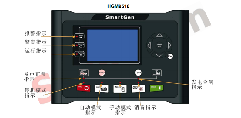 用于多臺同容量或不同容量的發(fā)電機組手動/自動并聯(lián)系統(tǒng)以及適用于單臺發(fā)電機組恒功率輸出和市電并網(wǎng),實現(xiàn)發(fā)電機組的自動開機停機/并聯(lián)運行、數(shù)據(jù)測量、報警保護及“三遙”功能??刂破鞑捎么笃聊灰壕?LCD)圖形顯示器,可顯示中文、英文及其他多種語言,操作簡單,運行可靠。 ·具有控制GOV和AVR的功能,可以自動同步及負荷均分,和裝有HGM9510控制器的發(fā)電機組進行并聯(lián)。控制器準確監(jiān)測發(fā)電機且的各種工作狀態(tài),當發(fā)電機組工作異常時自動從母排解列,關(guān)閉發(fā)電機組,同時將故障狀態(tài)顯示在LCD上??刂破鲙в蠸AEJ1939接口,可和具有J1939接口的多種電唝發(fā)動機ECU(ENGINE CONTROL UNIT)進行通信。 ·采用32位微處理器技術(shù),實現(xiàn)了多種參數(shù)的精*密測量、定值調(diào)節(jié)以及定時、閾值整定等功能,大部分參數(shù)可從控制器前面板調(diào)整,所有參數(shù)可使用PC機通USB接口調(diào)整,又可使用PC機通過RS485接口調(diào)整及監(jiān)測。其結(jié)構(gòu)緊湊、接線簡單、可靠性高,可廣泛應(yīng)用于各類型發(fā)電機組自動化并聯(lián)系統(tǒng)。