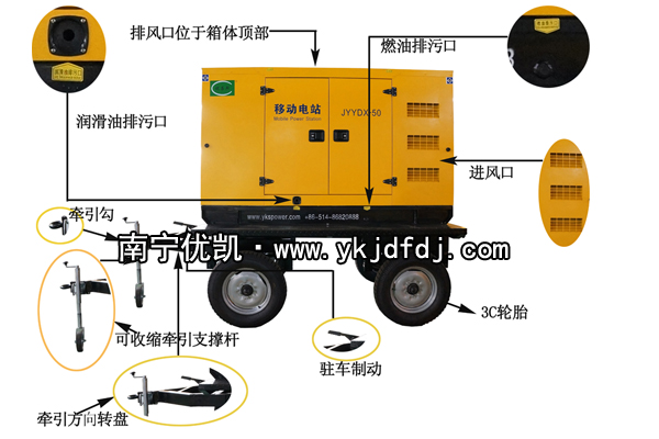 低噪音箱體安裝在移動拖車上,結(jié)構(gòu)一體化,箱體底座與拖車采用螺栓固定方式(保證箱體和拖車的正常連接)。有靈活方便的牽引桿,牽引標桿加裝了活動式支撐小輪,方便機組轉(zhuǎn)向,移動底盤與牽引車之間有靈活的方向性,使牽引方便,移動發(fā)電機組能承受行駛和運輸過程中的震動和沖擊。
